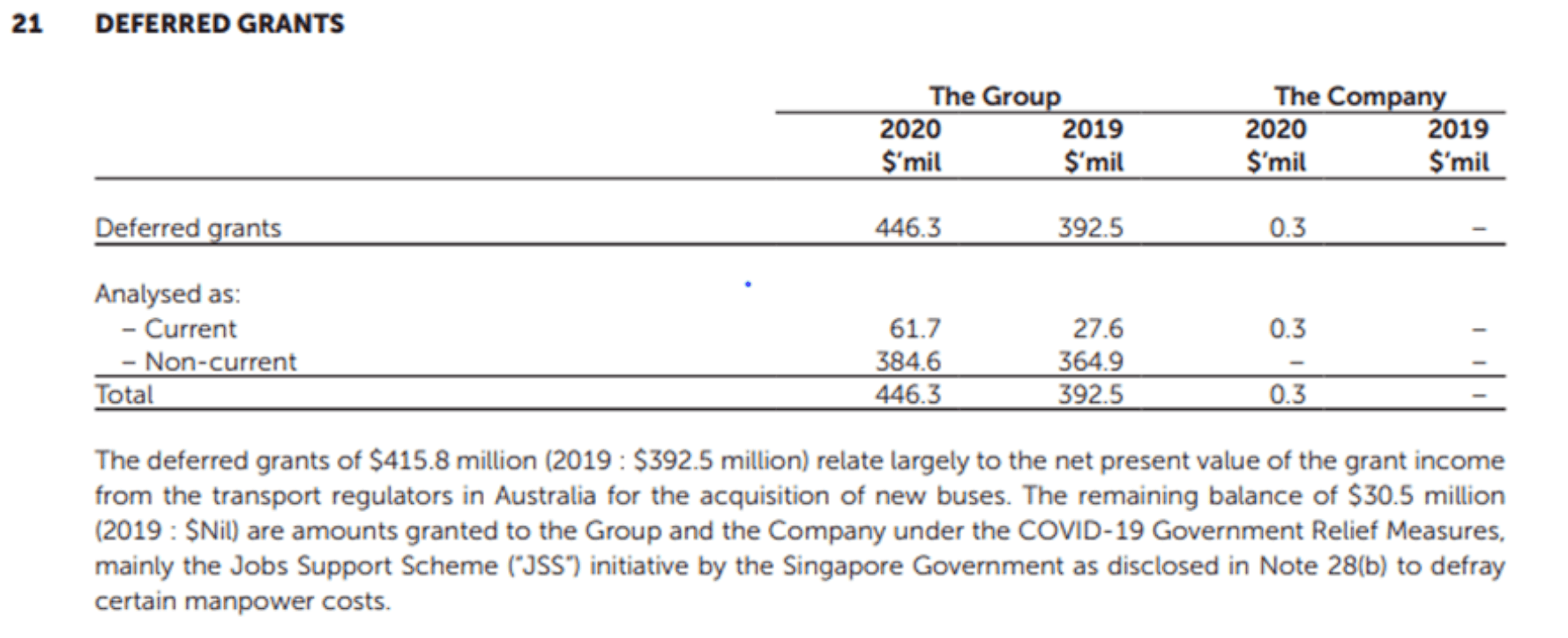According to the Statement of Financial Position, as shown above, there is an increase in Total Grant Receivables from a total of $321.9 million ($280.3 million + $41.6 million) in 2019 to $346.4 million ($279.1 million + $67.3 million) in 2020, this is due to the grant receivables from the Australia President and from the Singapore Government Relief Measures such as Job Support Scheme Initiative towards ComfortDelGro.